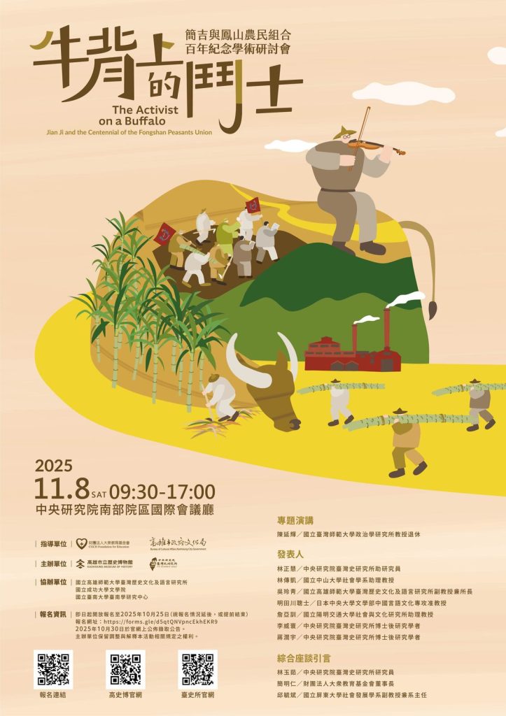 高雄市立歷史博物館即日起至2025年11月30日,推出「牛背上的鬥士—簡吉與鳳山農民組合百年紀念」特展。1920年代,一群青年立志守護臺灣農村,援助貧苦佃農的生計。他們之中,帶著小提琴的革命家—簡吉,深受農民敬愛。他協助高雄農民成立「鳳山農民組合」,其前身「鳳山小作人組合」,是臺灣最早的農民運動組織。