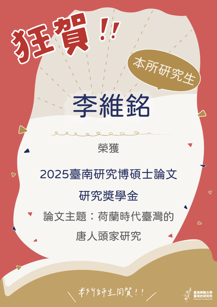 恭賀本所研究生李維銘榮獲2025臺南研究博碩士論文研究獎學金
