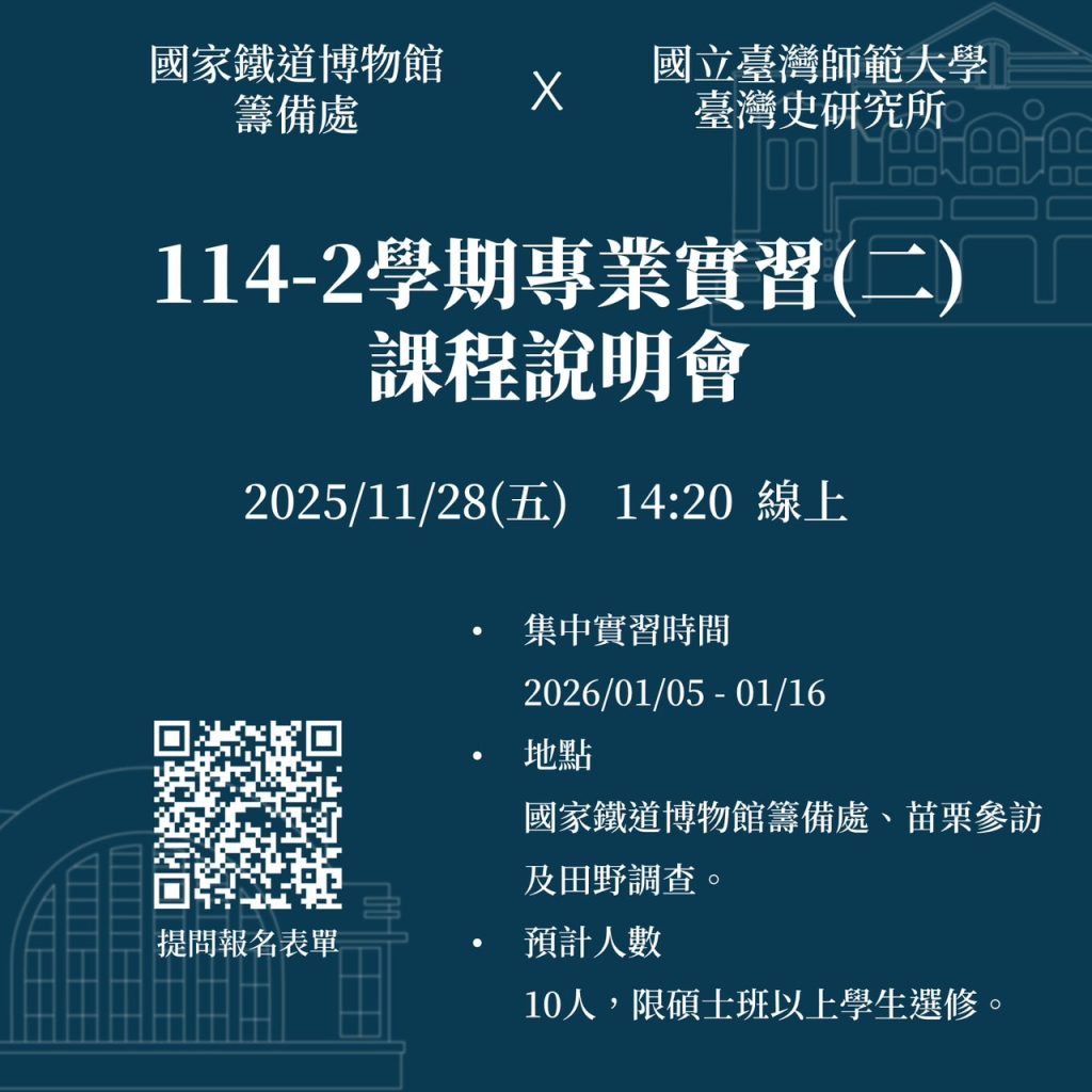 - 將於2025年11月28日(五) 下午14:20時於線上舉行實習課程說明會,