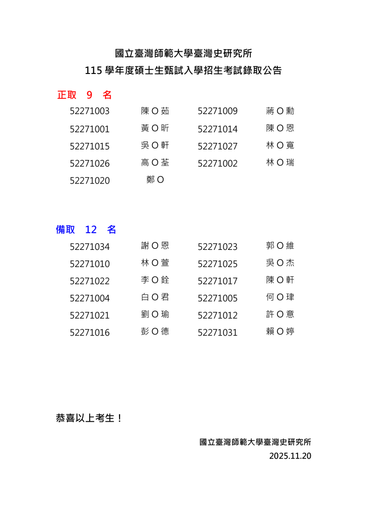 正取生網路報到:自114年11月24日(星期一)上午9:00起至114年11月27日(星期四)下午4:00止。