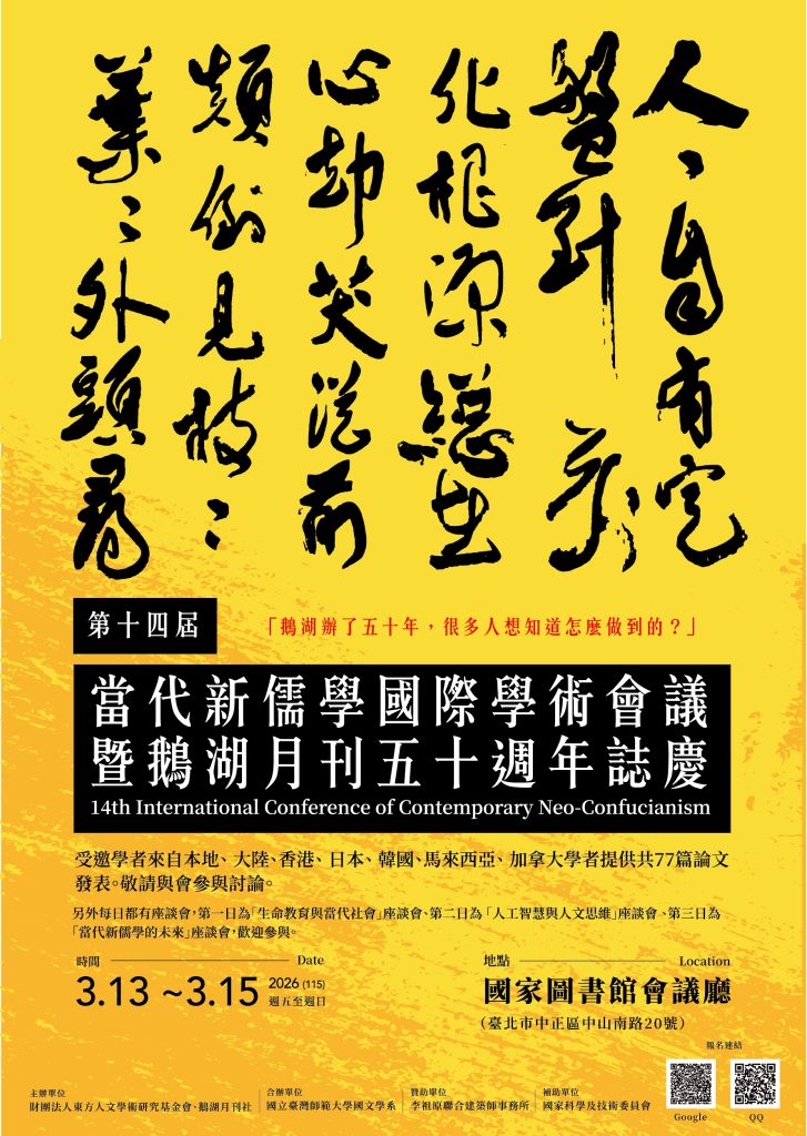 財團法人東方人文學術研究基金會、鵝湖月刊社將於2026年3月13-15日,舉辦「第十四屆當代新儒學國際學術會議──鵝湖月刊五十週年誌慶」,歡迎踴躍報名參加。
