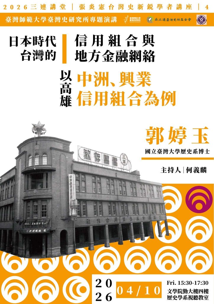 【學術活動】2026三連講堂:日本時代台灣的信用組合與地方金融網絡–以高雄中洲、興業信用組合為例