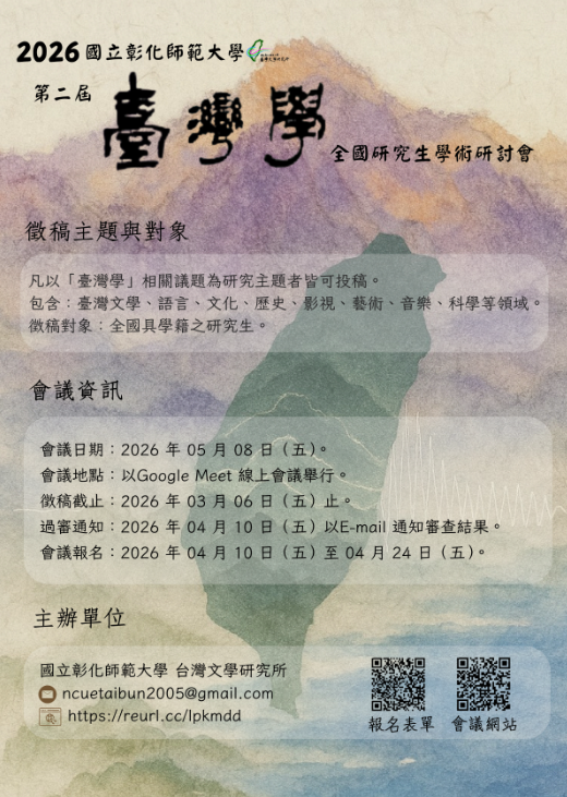 【活動轉知】彰化師範大學臺灣文學研究所-第二屆「臺灣學」全國研究生學術研討會開放報名!